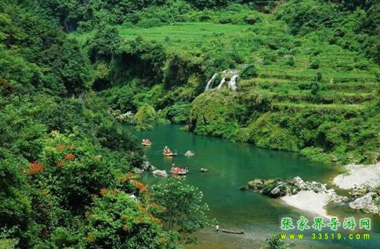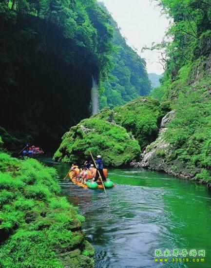 天下第一漂,起點(diǎn)哈妮宮距王村約40公里,行車1小時,終點(diǎn)牛路河距王村30分鐘的車程,漂流水路長17公里,漂流兩個半小時。從哈妮宮放舟而下,一路是古老的河道,絕壁百里,怪石嶙峋,灘奇水異,兩岸蒼翠的林木,云霧繚繞,飛瀑流泉與溶巖峰林交相輝映。拐一百五十五個彎,在一百三十三個灘潭中穿梭而行,迂回流連,馳魂奔魄,心曠神怡。