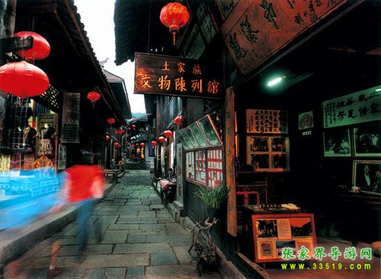 拾級而上,山路一般的陡峭。從碼頭開始綿亙而上的石階,那是一條長達五里貫穿古鎮(zhèn)的青石板路,它沒有名字,于是人們就直接管它叫五里長街。踏上古街,似乎踩在被悠長歲月遺落的碎片上面。不知不覺走到掛有“土家觀瀑吊腳樓”牌匾的民俗博物館前,從手搖腳踏的棉花機、閹豬鳴號的羊角到世代相傳的雕花牙床,近百件散發(fā)著鄉(xiāng)土氣息的民間用具,展示著土家族古老豐富的歷史??醋o人說,這是一位土家族年輕人爬山涉水收集來的,靜靜地訴說著這個小村古老的過去。這棟三層的小樓,一半落在河岸上,另一半?yún)s是由水泥柱支撐著,水泥柱直插河底,任水流日日夜夜地沖刷,小小的吊腳樓仍穩(wěn)穩(wěn)當(dāng)當(dāng)站在那里,任憑時間的流逝。好聰明的土家人,巧借一片水面,竟建起了如此妖嬈的住房。