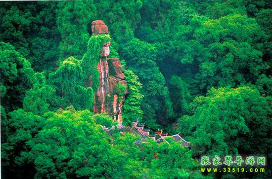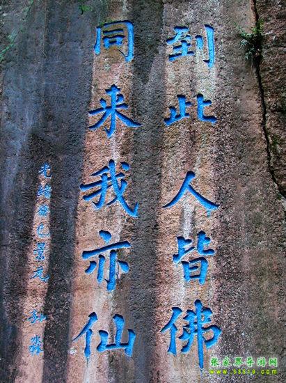 不二門(mén)內(nèi)由石灰?guī)r風(fēng)化形成的一尊巨大石佛,聳立于萬(wàn)綠叢中,高六丈,青冠白面,頭頂白云,腳踏碧水,人們以其形神稱(chēng)為“觀音巖”?!队理樋h志》稱(chēng)“觀音巖素有‘湘景名峰第一巖’之稱(chēng)”。觀音巖下,聳立著一組瑰麗多姿、古色古香的殿閣建筑群,這就是“嵩山堂”,包括三觀殿、玉皇閣和禪房客舍,工藝精巧,玲瓏別致。特別是正殿后的地藏庵,與老司城明代建筑祖師殿結(jié)構(gòu)相似,背倚石壁,右通八陣圖,左達(dá)熱水坑,周?chē)质校拍緟⑻?。觀音巖北部山上是天造地設(shè)的“八陣圖”,有的如排戟,有的似春筍;有的像古佛,有的若走獸。八陣圖之奇,不僅在于它林立的怪石,最主要的是在于由龜裂紋石板鋪成的時(shí)上時(shí)下時(shí)隱時(shí)現(xiàn)的彎彎小徑——或穿過(guò)地下幽深的石洞,或延展于密林雜草叢中,或環(huán)繞于奇峰怪石之間,使八陣圖的東、南、西、北四門(mén)相通,復(fù)雜繁多的石徑互相連接形成網(wǎng)絡(luò),人們有時(shí)難以找到出路。也許,這就是八陣圖命名的緣由。不二門(mén)內(nèi)兩側(cè)石壁開(kāi)闊如屏,歷代文人墨客或贊山水之幽絕,或抒心胸之豪情,雕鑿了種種摩崖石刻。據(jù)《永順縣志》記載,不二門(mén)石刻有神秀獨(dú)鐘、吾道南來(lái)、白云門(mén)開(kāi)、砥柱中流、眼前南海、百寶勝光、別開(kāi)生面、別有天地等100多處。歷經(jīng)風(fēng)雨滄桑之后,現(xiàn)僅存鬼斧神工、勝境無(wú)雙、滌盡塵氛、瞻奇仰異、海上飛來(lái)等數(shù)十處。清代名士白介庵所作《松徑留云》、《古洞仙蹤》、《層閣聳翠》、《玉嶂屏環(huán)》、《澄潭月影》等觀音巖八景詩(shī)尚凸現(xiàn)在石壁之上。其中《石門(mén)天鑿》一詩(shī)完整無(wú)缺:“法門(mén)高聳五云偎,鬼斧神工妙化裁。鞭石無(wú)痕還著相,振山有鐸不須錘。地沾花雨千歧坦,道接薪傳一線(xiàn)開(kāi)。莫道終南稱(chēng)捷徑,巨靈神辟小蓬萊。”清代庚辰年間的探花景元,曾在石壁上題刻“到此人皆佛,同來(lái)我亦仙”。他還以一筆揮成的“山青海岸”疊字如圖似的符合成一個(gè)“岸”字鑿刻在摩崖之上,堪稱(chēng)罕世之作。石壁上近年來(lái)還鐫刻了偉人毛澤東的詩(shī)詞和儒將蕭克、畫(huà)家黃永玉等巨擘的題字,游人置身其間,飽享山水美景、名勝古跡與文化藝術(shù)的熏陶。