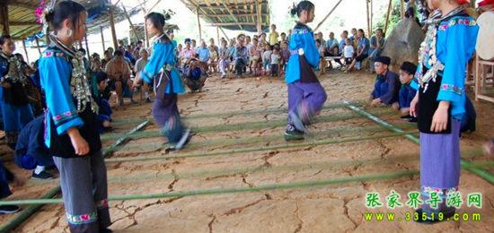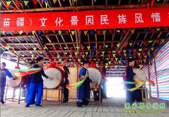 夢幻苗疆進(jìn)寨必須經(jīng)過苗族人民接待遠(yuǎn)方賓客的歡迎儀式“攔門三卡” 唱攔門歌、喝攔門酒、敲苗家花鼓,通過后,方能進(jìn)寨。