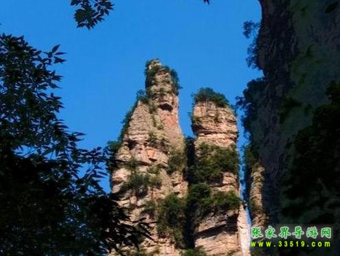 沿田家臺(tái)后坡石徑上行約400米,有一座依山而立的觀景臺(tái)。站立臺(tái)上,見對(duì)面200多米處兩峰相依,酷似一堆夫妻并肩而立,五官俱全,面向東南。那峰頂?shù)臉淠净ú萸∷扑麄z的頭發(fā)、頭巾和頭飾,反襯出二人臉面白凈明晰。妻子?jì)尚?,緊傍其夫,低眉含羞,似竊竊私語(yǔ);丈夫粗狂豪達(dá),眉飛色舞,笑口張開,皓齒畢露,似充滿幸福和滿足。眾多游客觀此景時(shí)無(wú)不驚嘆稱奇,以致廣泛傳言:觀賞后,新婚夫婦忠貞不渝,老年夫婦煥發(fā)青春,反目夫婦重歸于好。