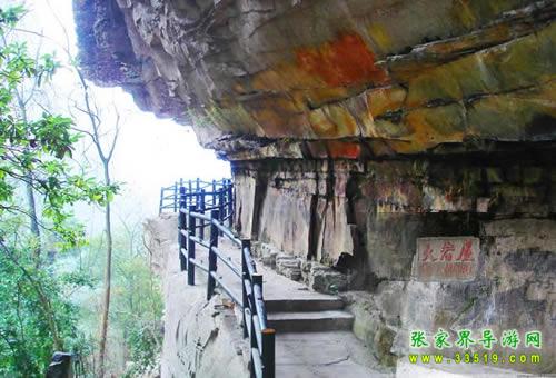 羅漢迎賓上方西南側石壁上,有一處空間高約3米、深1-3米、長20多米的巖屋,是絕妙的觀景臺。登臺南眺,遠山如黛。近處左上側有石峰數(shù)座,倚天而列。北邊一峰類人,西向側面而立,似頭著兜鍪,身披甲胄,左臂下垂,傲視藍天,游人戲稱“獨臂武將”。巖屋下20米,一峰如葫蘆豎立,高約30米,直徑約10米,底、肚、頸、口俱全,附生的草木如花紋圖飾,一塊重達數(shù)噸的石板蓋于口上,稱”仙丹葫蘆“。對面一組山峰形如駱駝踽踽東行。駱駝前方是一山坡,有草無樹,夏日青似草原,秋天黃如大漠,駱駝正向那里走去。