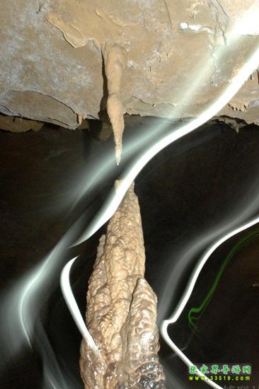 在這兒向您介紹一點溶洞學(xué)的知識。在溶洞中,自洞頂往下生長的叫石鐘乳,自洞底往上生長的叫石筍,兩者相向生長連在一起就叫石柱,三者統(tǒng)稱為鐘乳石。這兒有一根石鐘乳與一根石筍是相對生長的,差一點點就要連起來了,但他們卻永遠不能合在一起,因為上面的石鐘乳已經(jīng)沒有滴水,已經(jīng)失去了生命力。這好像一對苦苦守望的情人,近在咫尺,卻永遠不能相逢。于是人們便給他們?nèi)×艘粋€非常動人的名字——恨難逢。“盈盈一水間,脈脈不得語。”“天涯海角有窮時,只有相思無盡處。”在無數(shù)個春去秋來的日子里,他們該有多少離愁別緒??!——真不知道是石頭多情,還是人多情?——而有的人說得很樂觀,“兩情若是長久時,又豈在朝朝暮暮”,所謂“距離產(chǎn)生美”嘛。