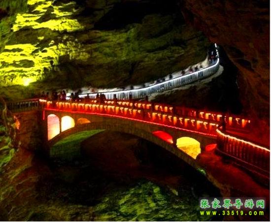 橋長22米,橋面寬3米,距水面17米,這是我國游覽洞穴中最大的石拱橋,是為迎接1995年國際溶洞會議在黃龍洞召開而修建的。橋的欄桿全部用當(dāng)?shù)氐?ldquo;土特產(chǎn)”木紋石建造。