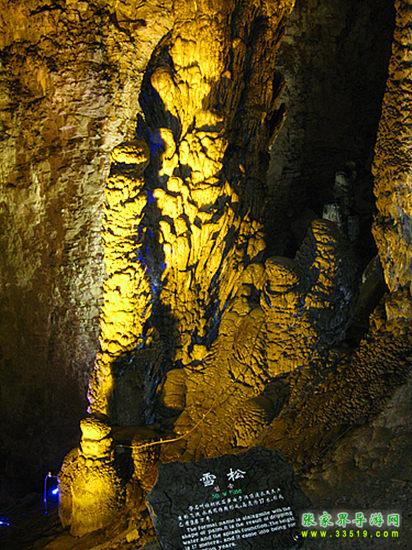 “大雪壓青松,青松挺且直。要知松高潔,待到雪化時。”這根高大的石筍就像一棵被大雪覆蓋得嚴(yán)嚴(yán)實實的松樹。它的科學(xué)名稱叫做棕櫚狀石筍,一般只能在高大的廳堂中見到。據(jù)科學(xué)家測算,它已經(jīng)在悠悠的歷史長河中挺立了10萬年。有趣的是,在雪松根部還散落著許多可愛的小松果呢!