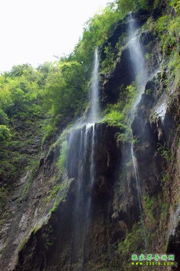 【珍珠墻】過了神泉橋,請大家留步,做一個短暫的停留。請大家看,我們的面前,石壁之上,生長著很多植物,很多草類,山上的泉水沿著石壁,以均勻的流量漫流下來,在這些草葉上、枝枝蔓蔓上形成了一個個潔白晶瑩的水珠,大家看像不像珍珠?游客朋友們都將這堵石壁叫做珍珠墻,掛滿珍珠的石墻啊。