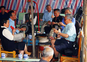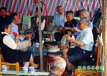 圍鼓(含嗩吶)。又稱打鎦子、打排鼓,是民間紅白會(huì)中不可缺少的樂(lè)器。一般7人演奏,樂(lè)器有一鼓、一大鑼、一公鑼、兩副鈸、兩嗩吶。其詞曲紅白會(huì)通用,以鼓和嗩吶上系紅、白布為分別標(biāo)記(結(jié)婚不打“四字鈸”曲)。史傳的圍鼓詞有《撩子》、《火鋪》等,《撩子》分《一二三》、《閃翅》、《堆羅漢》、《反落花》等十章,《火鋪》也分《三槍》、《四進(jìn)門》、《八哥洗澡》、《蓮魚(yú)吐絲》等十章,嗩吶詞有《八十正宮》調(diào)等。在農(nóng)村,圍鼓是最普及的樂(lè)器,每逢紅白喜事都有圍鼓和嗩吶表演。