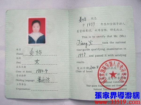 | 姜怡,女,導游員資格證書編號:Hun990125。 大專學歷,自99年9月森林保護節(jié)前開始從事導游工作,同年十二月參加全國導游員資格考試,并以優(yōu)異成績?nèi)〉谩皣鴮ёC”,現(xiàn)為張家界華天國旅旅行社的專職導游員。整個帶團期間,無論團隊或散客,未出現(xiàn)一次旅游事故或游客投訴事件,普遍反映帶團效果好。 | 導游自述