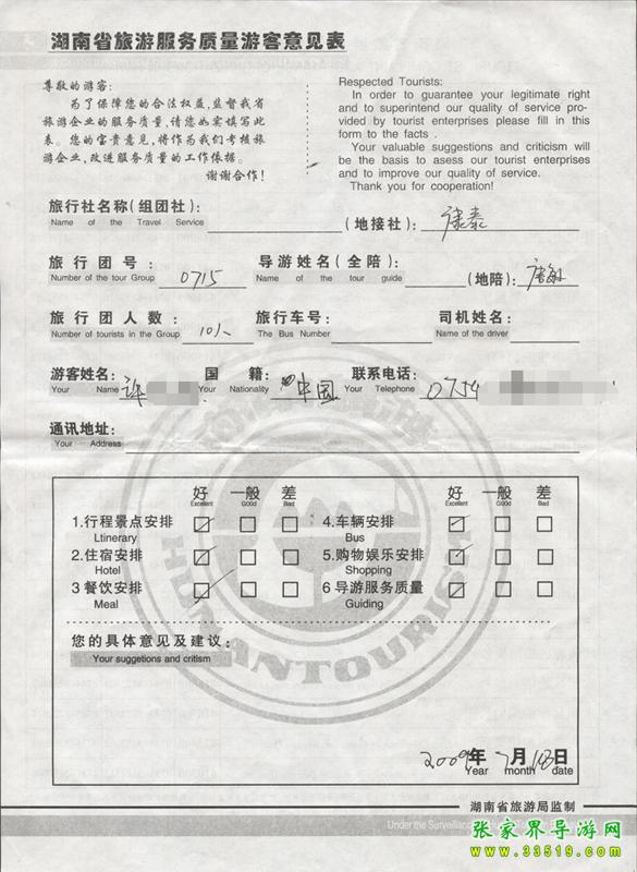 2009年7月15日許先生一行10人質(zhì)量接待反饋單: